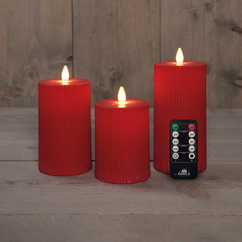 Set van drie Anna's Collection LED kaarsen flame effect ribbel rood