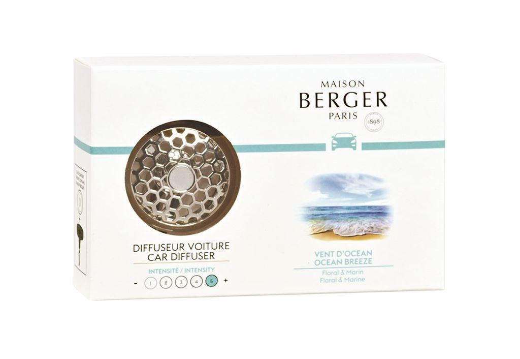 Stel u een pad langs de zee voor, een kust om te volgen, een strand om te bereiken.. Het Auto Diffuser Vent d'Ocean van Maison Berger Paris, een klein accessoire, rond en glinsterend, maakt deze route nog mooier.. De autodiffuser dat bij het Auto Diffuser Vent d'Ocean zit, is een esthetisch object ontwikkeld met een honingraatpratroon en een resoluut moderne chroomkleur. Deze duurzame autodiffuser die 100% navulbaar is, klikt u eenvoudig op het ventilatierooster van uw auto waarna u vier tot zes weken kunt genieten van het Auto Diffuser Vent d'Ocean: een bloemig en waterachtig huisparfum dat u in gedachten meeneemt naar een helderblauwe oceaan.. 100% navulbaar met de Navulling Auto Diffuser van Maison Berger Paris. Het Auto Diffuser Vent d'Océan bevat 1 autodiffuser en 1 navulling Vent d'Océan.