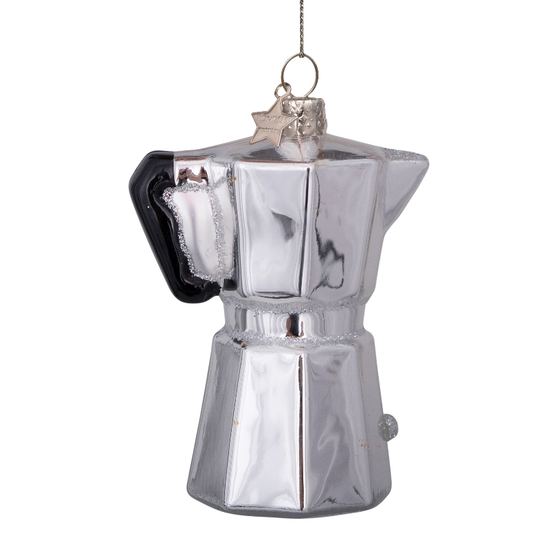 Vondels' koffiezetapparaat glazen kerstbal. Deze mooie mond geblazen Vondels kersthanger mag natuurlijk niet in jouw kerstboom ontbreken. Dit kerstornament van Vondels is 9cm hoog en daarom goed te combineren met andere glazen kerstballen.